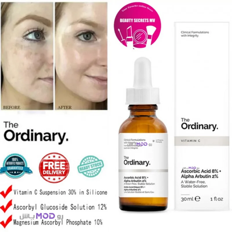 سرم آسکوربیک اسید 8% و آلفا آربوتین 2% اوردینری با حجم 30 میلی لیتر و محصول کانادا، یکی از موثر ترین سرم های روشن کننده پوست است. این سرم سرشار از ویتامین C خالص بوده و خاصیت آنتی اکسیدانی دارد و سبب محافظت از پوست می شود. سرم آسکوربیک اسید 8% + آلفا آربوتین 2% برند Ordinary با تقویت پوست، هر گونه علائم پیری و خطوط و چین و چروک ها را بهبود می دهد. این سرم لک ها و تیرگی های پوستی را به طرز چشمگیری کاهش داده و پوست را روشن و شفاف می کند.