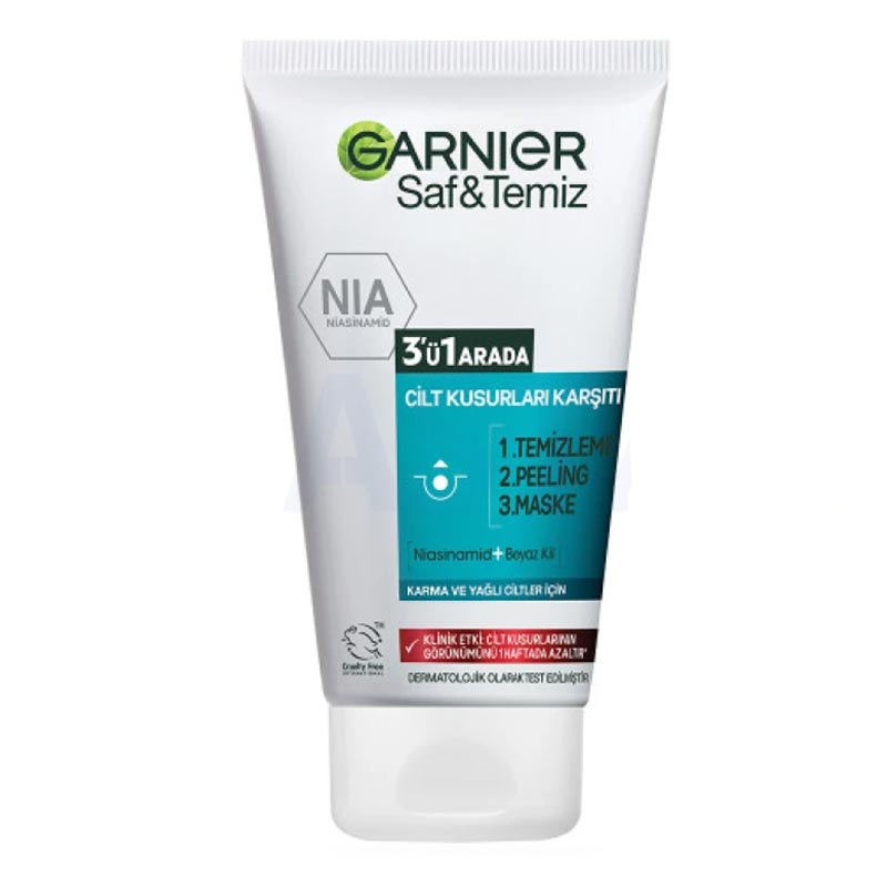 ماسک صورت سه کاره گارنیر مدل Saf & Temiz دارای حجمی معادل با 150 میلی لیتر برای پوست های چرب و مختلط مناسب است که در آن سه فرمول در یک محصول است و می توان از آن به عنوان ماسک، لایه بردار و پاک کننده استفاده کرد. این محصول دارای فرمولاسیونی فوق العاده بوده و ترکیبات مفیدی مانند عصاره اکالیپتوس، خاک رس سفید و اسید سالسیلیک را در خود جای داده است. از مزیت های مهم این محصول می توان به از بین بردن چربی اضافی پوست اشاره کرد که به صورت ظاهری مات می بخشد.